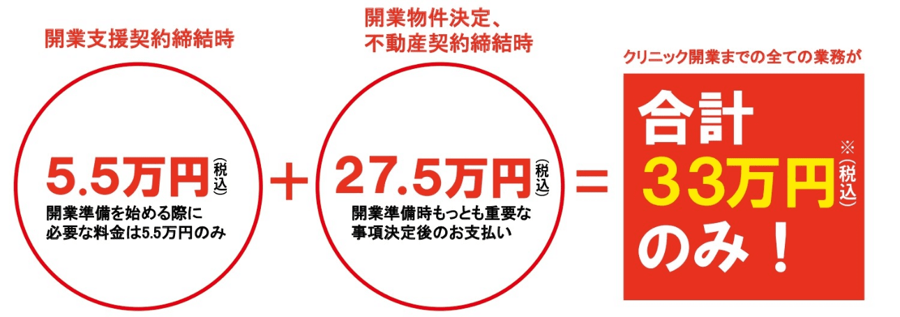 弊社では、開業支援契約締結時に5.5万円、開業物件決定後に27.5万円、合計33万円のみ(消費税込)ですべての開業支援業務を行います。